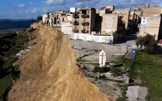 A cruz que havia sobrevivido ao deslizamento de terra que atingiu a cidade de Niscemi, na ilha italiana da Sicília, desabou em um precipício.