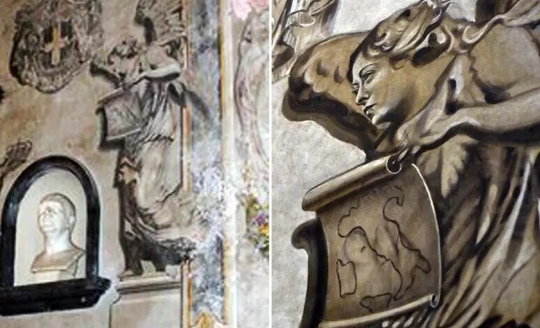 O afresco fica na Basílica de San Lorenzo in Lucina, a 400 metros da sede do governo italiano, e retrata uma figura alada segurando um pergaminho com o mapa da península, ao lado de um busto do último rei do país, Umberto II.