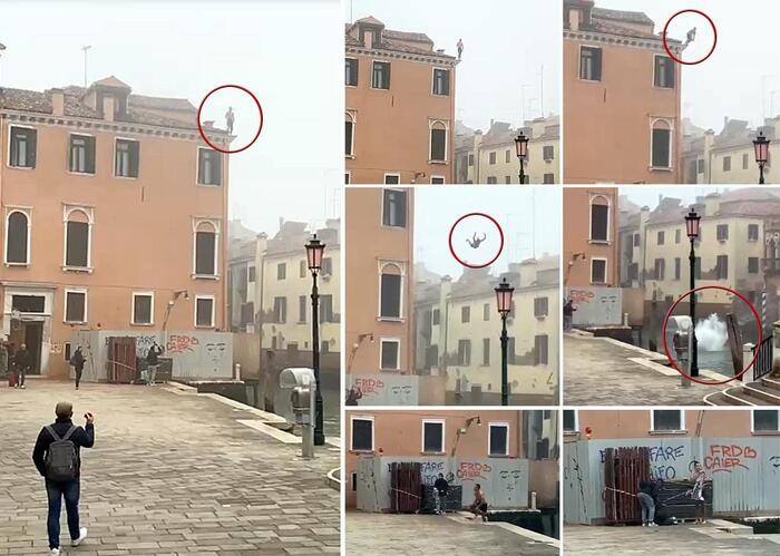 Nas imagens, que viralizaram na web, é possível ver o momento exato que o cidadão se posiciona na beira do telhado de um edifício e salta no rio San Pantalon, atrás do Campo Santa Margherita.